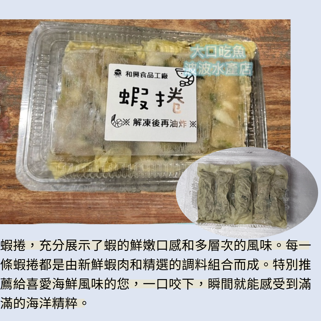 【品 名】 蝦捲 【產 地】 台灣 【規 格】 10條 【保存期限】 以產品實際標示為主 【保存方式】 冷凍-18℃ 【包裝方式】 盒裝